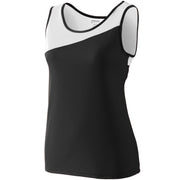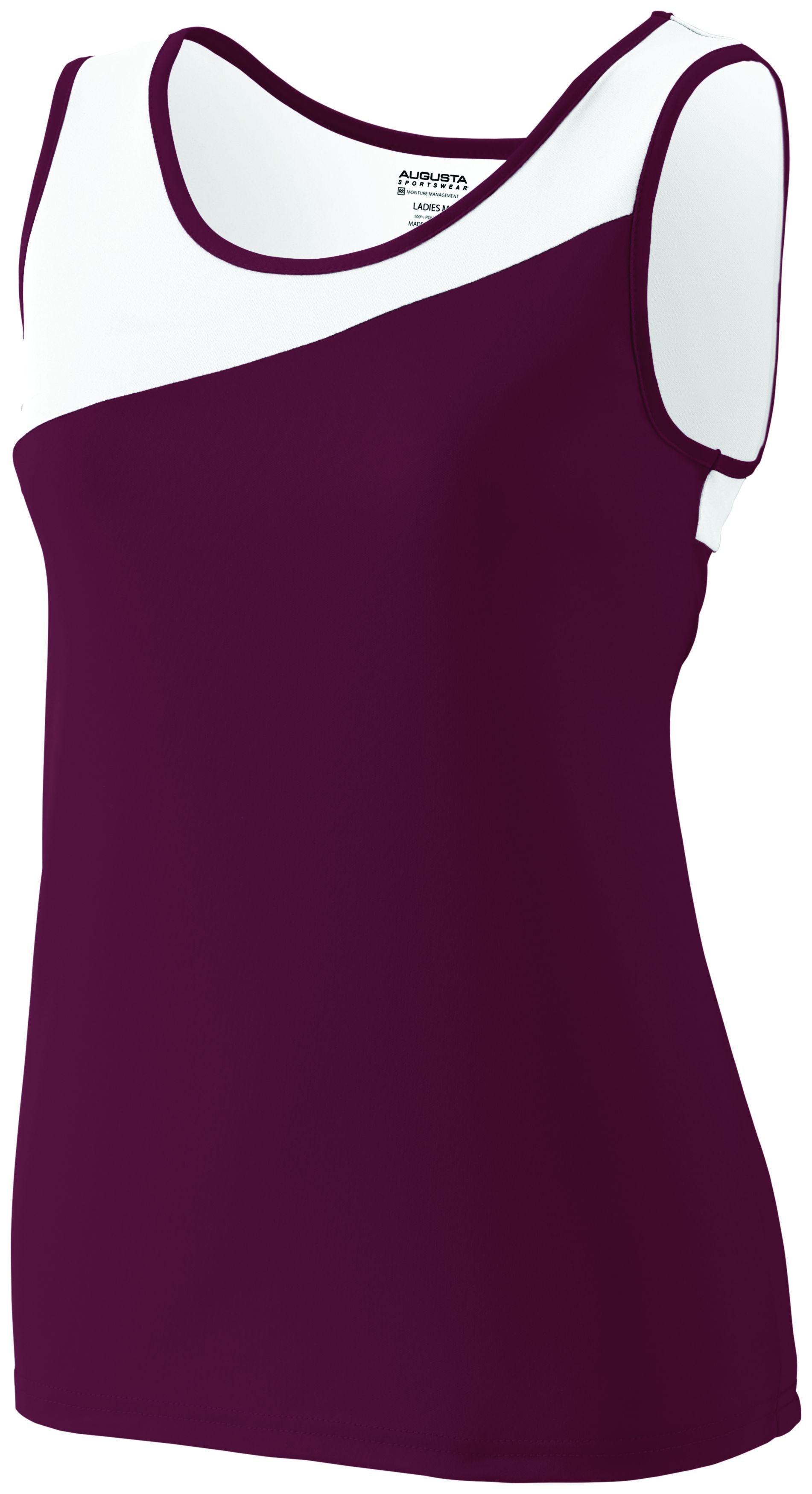 100% polyester wicking knit * Wicks moisture * Ladies' fit * Tagless label * Asymmetrical contrast color yoke