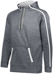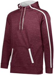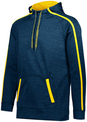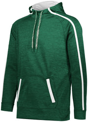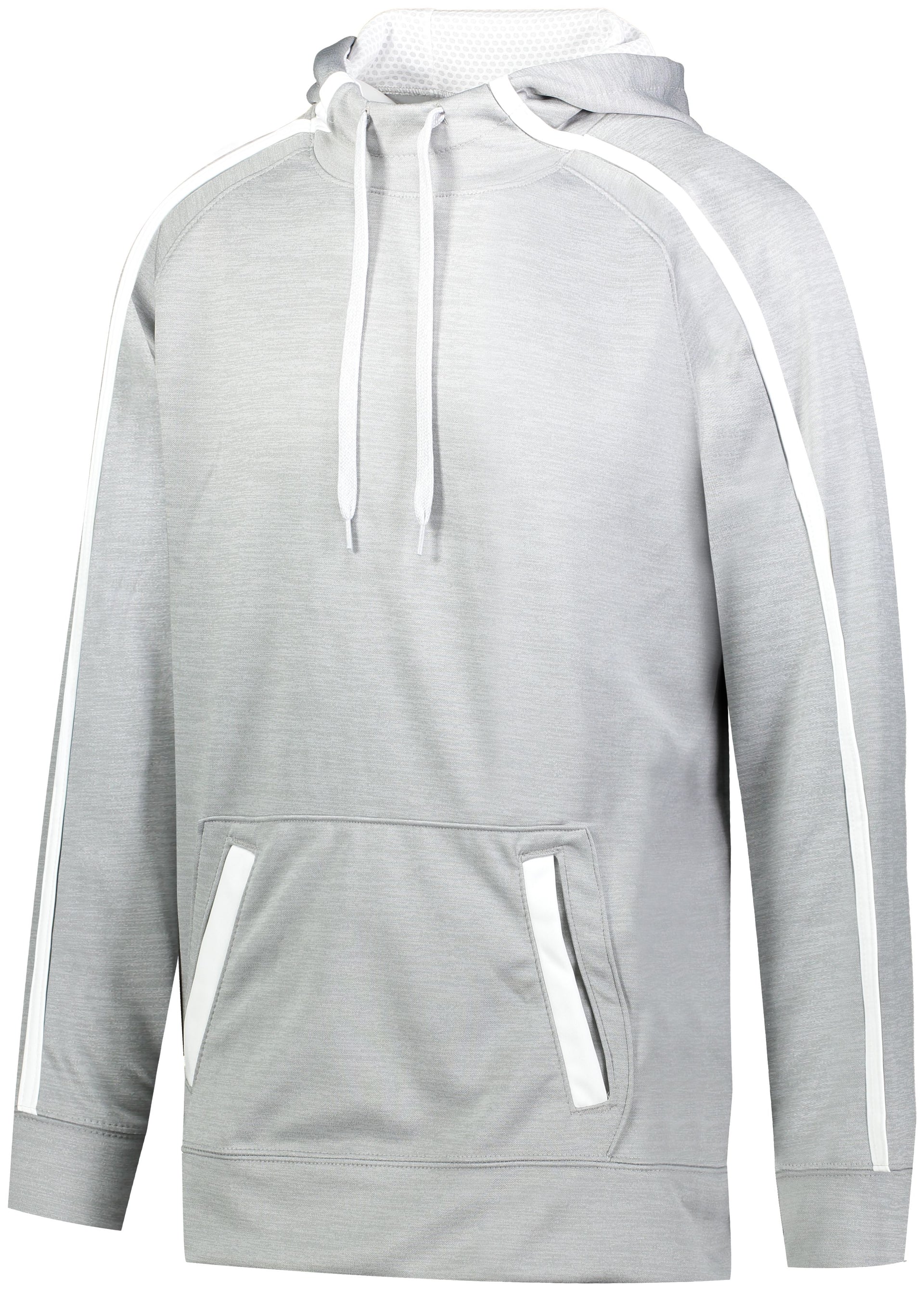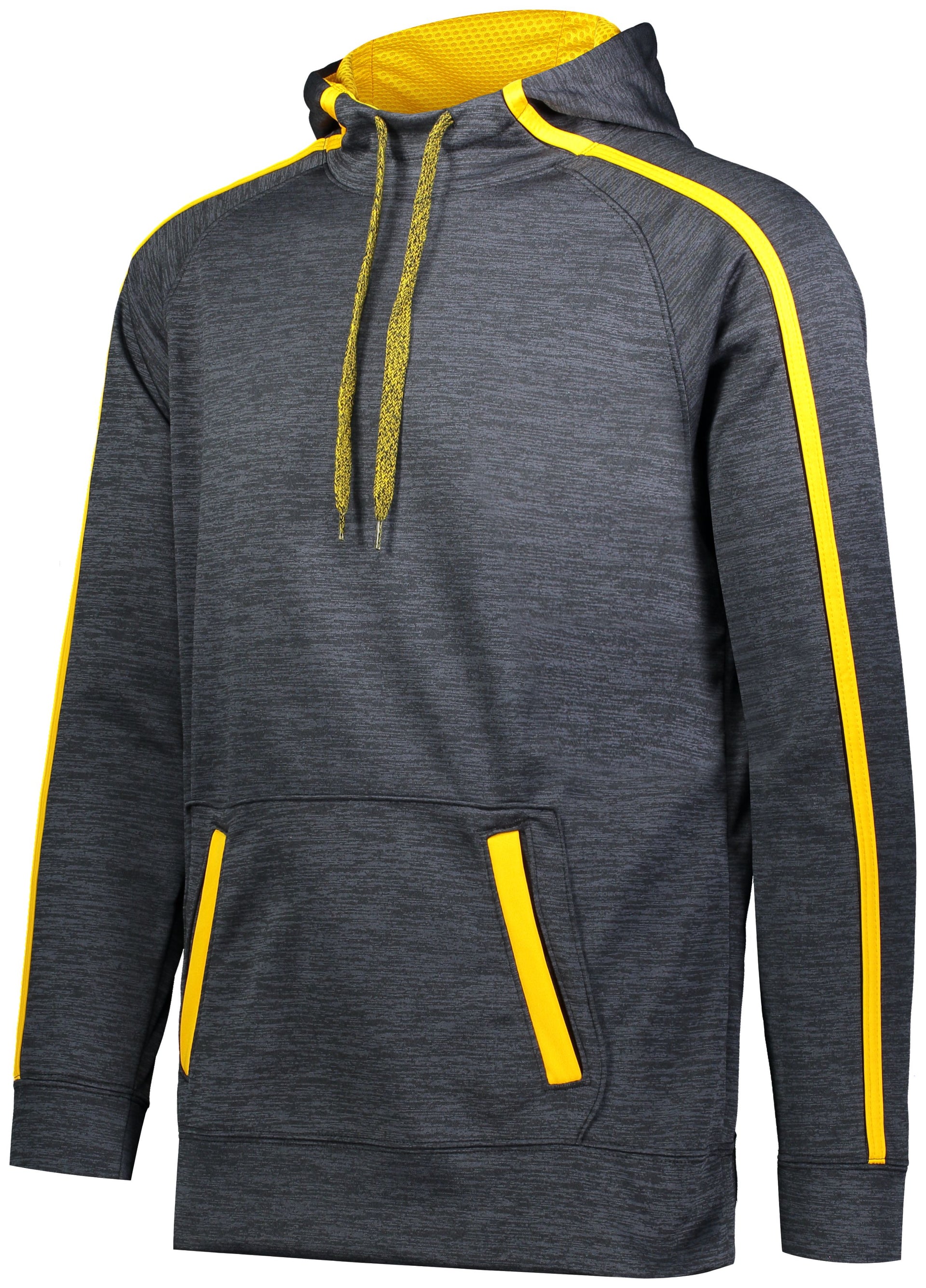 7.1 ounce 100% polyester tonal performance wicking fleece * 100% polyester performance wicking fleece solid contrast inserts and pocket welts * 3.35 ounce, 100% polyester mesh hood lining * Wicks moisture * Tagless label * Scuba shaped 3-piece hood with contrast color lightweight mesh lining and heathered tipped drawcord on Adult sizes only * Contract color sleeves stripes and front welt pockets * Raglan sleeves * Front pouch pocket * Self-fabric cuffs and bottom band