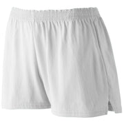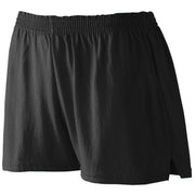 Heavyweight 50% polyester/50% cotton jersey knit * Ladies' fit * Elastic waistband * V-notch at sides * 3-inch inseam * Girls inseam graded