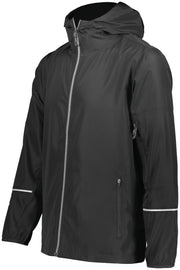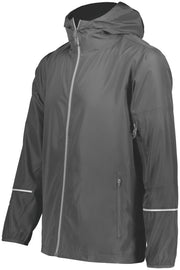 Stay warm and dry in the Packable Full Zip Jacket from Holloway. This water-resistant jacket features an adjustable hood with inside concealed cord locks, a reflective trim, and back vent with adjustable closure for full decoration access. Spandex bound cuffs and an adjustable bottom shock-cord closure make sure you keep the warmth in and the rain out.