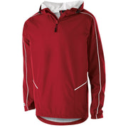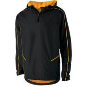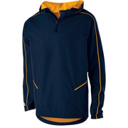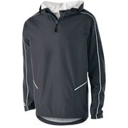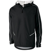 Micron™ polyester is a lightweight, wind/water resistant fabric * Micromesh lined nylon body & hood * Woven label * Quarter zip pullover style * Adjustable mesh lined hood with eyelets and concealed cord locks * Back vent with adjustable closure for full decoration access * Front zippered pockets * Half-elastic cuffs * Open bottom with adjustable elastic hidden drawcord * Dropped tail * Water-resistant